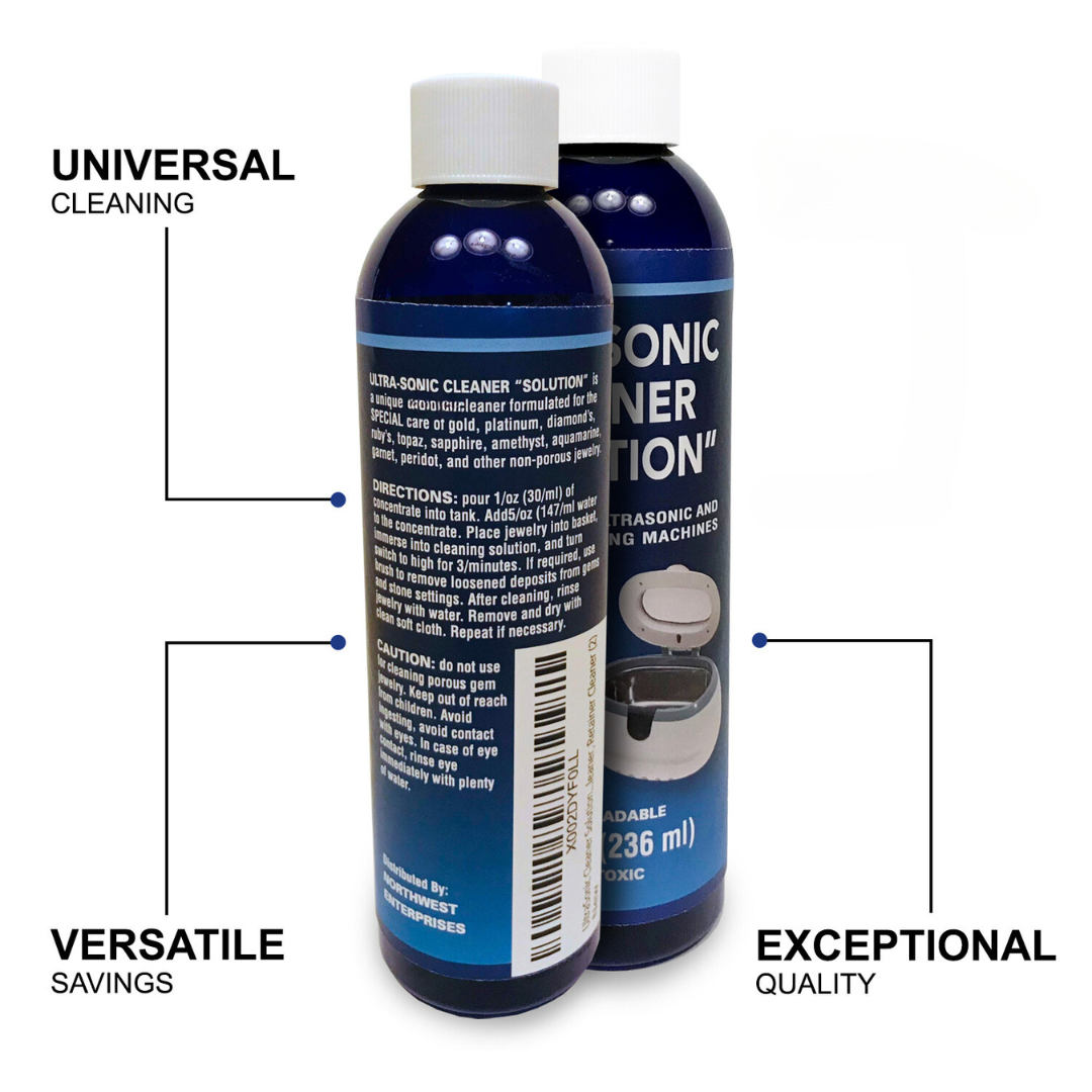 - UltraSonic Cleaner Solution: Our ultrasonic jewelry cleaner concentrate is formulated for your sonic jewelry cleaning machine to safely clean gold, platinum, diamond, ruby, sapphire, topaz, amethyst, aquamarine, garnet, and other non-porous precious and semi-precious gem jewelry! 2-Pack, Jewelry Cleaner Solution for Ultrasonic Machines Cleanings